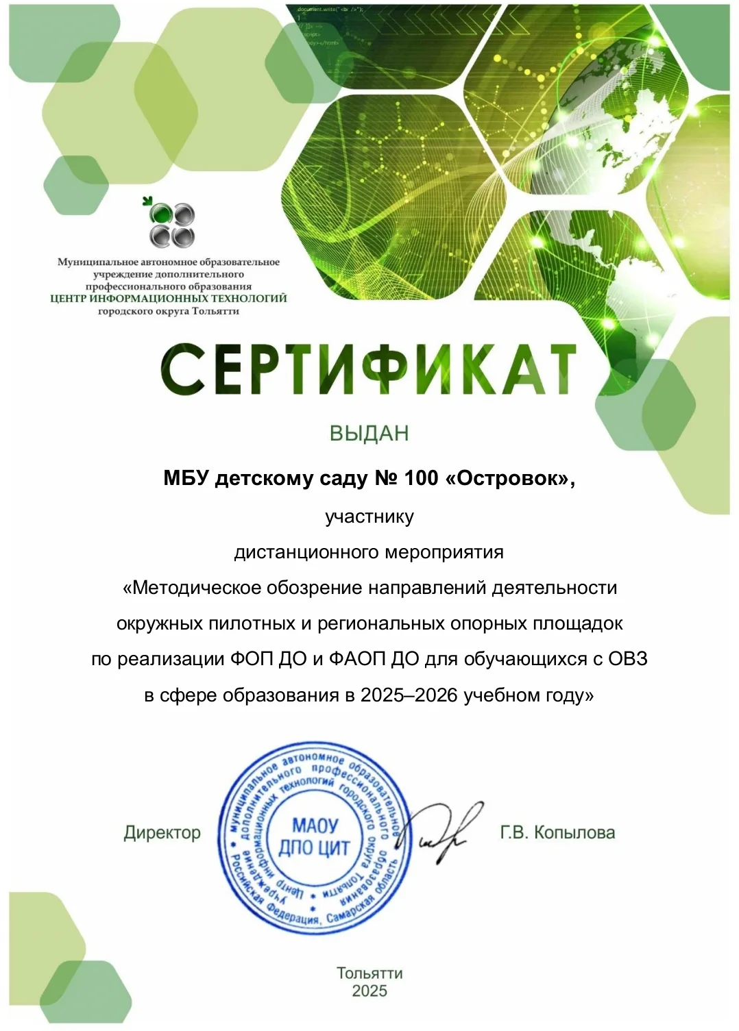 Муниципальное бюджетное дошкольное образовательное учреждение детский № 100 «Островок» городского округа Тольятти